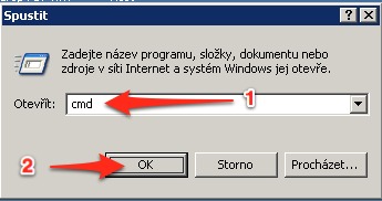 Spusťte Příkazový řádek – nabídka Start – Spustit – napište „CMD“ a potvrďte OK