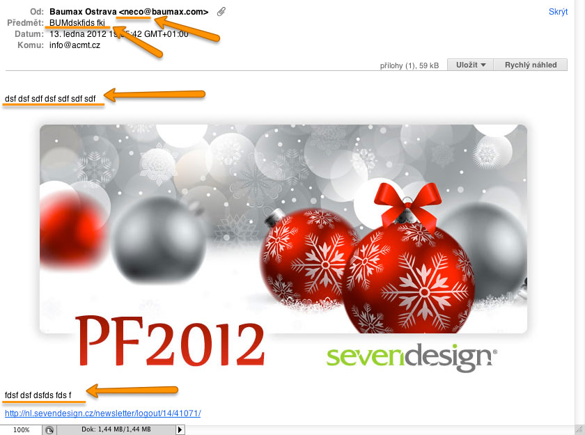 „Pé eFko“ 13. ledna z adresy neco@baumax.com, předmětem „BUMdskfjds fkj“ a textem „dsf dsf sdf dsf sdf sdf sdf“. Jo, když se daří, tak se daří 🙂