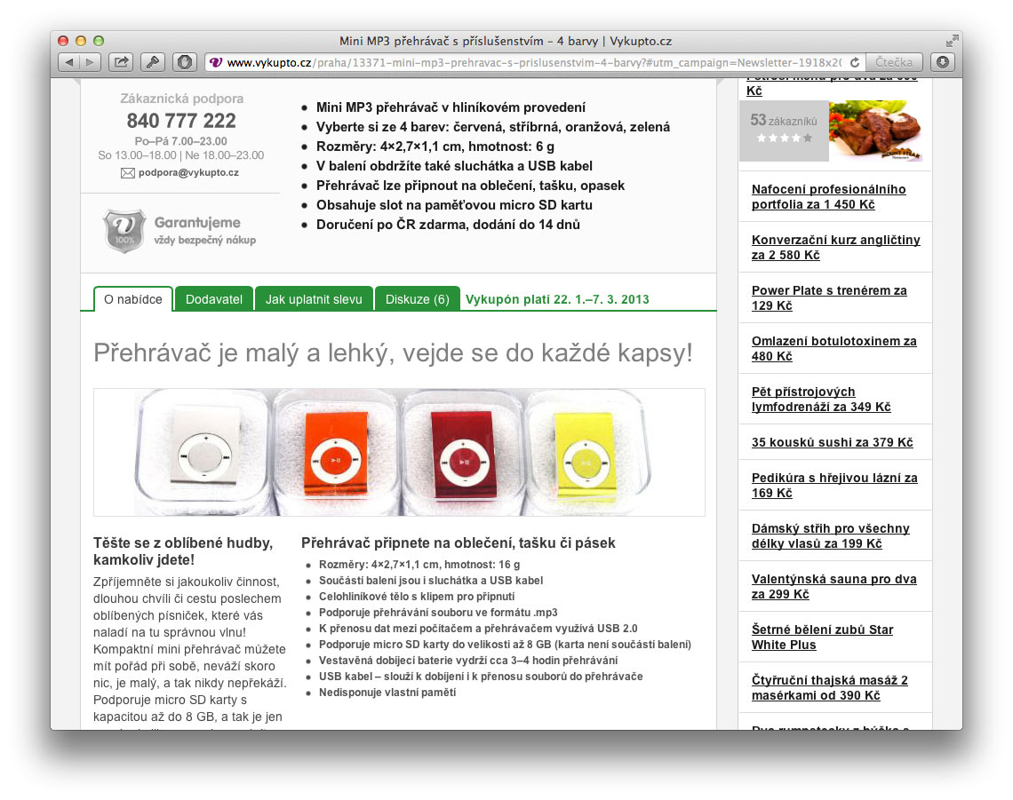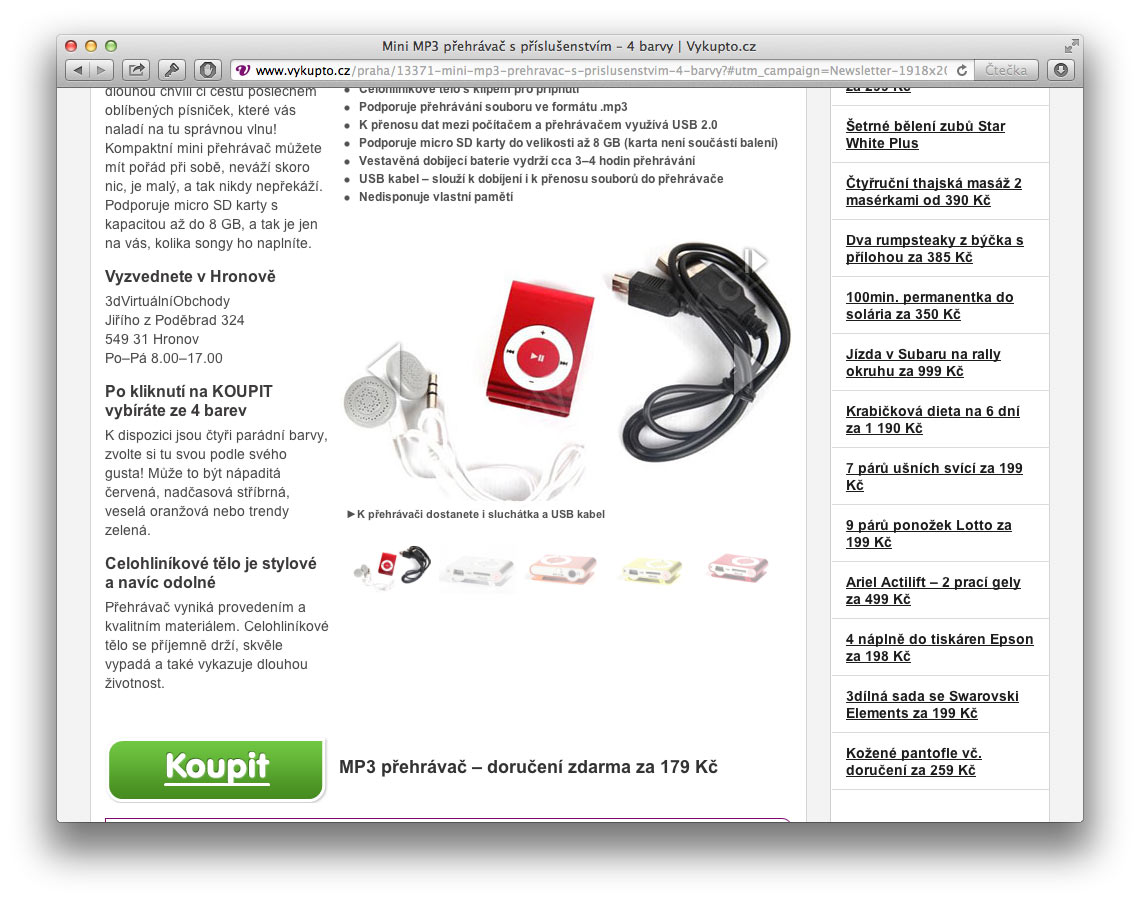 Na slevovém serveru VykupTo se objevila nabídka na „Mini MP3 přehrávač s příslušenstvím“, který zaujme cenou a dopravou zdarma. Vzhledem k tomu, že jsem si pod vánoční stromeček nadělil MP3 přehrávač Apple iPod shuffle, mě zaujal i designem. A to nejenom designem samotného přehrávače, ale i krabičky, ve které se dodává.