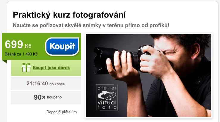 Nabídky slevových serverů jsou někdy výhodné, jindy zase méně, viz „nanopodložka za jedinečnou cenu„, ale začínají mě bavit. Třeba takový fotografický kurz za lákavou cenu 699 Kč v rozsahu 3x 45 minut určený pro malé skupiny o dvou až pěti lidech.
