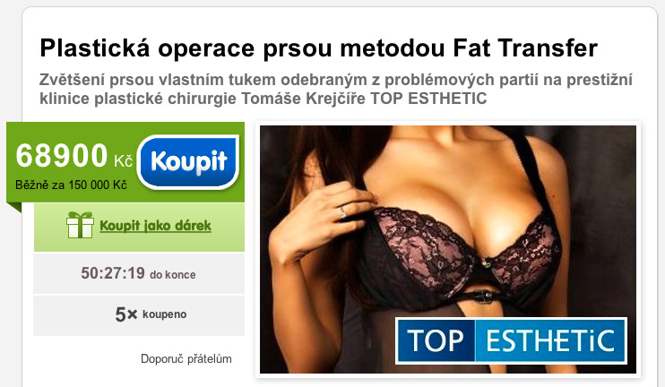 Pak mě ještě zaujala jedna nabídka. Opravdu se našlo pět zájemců, respektive zájemkyň, které si plastiku prsou objednají na slevovém serveru za téměř sedmdesát tisíc? 😉