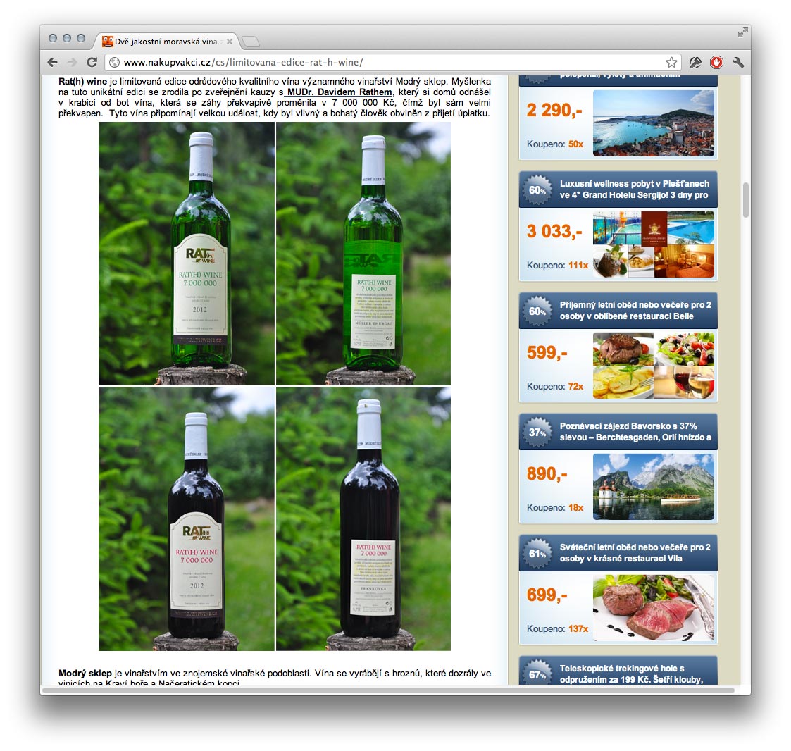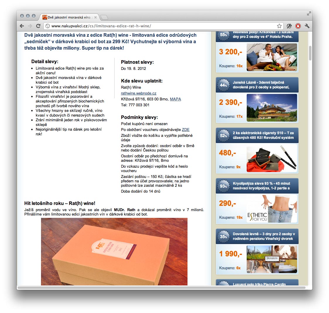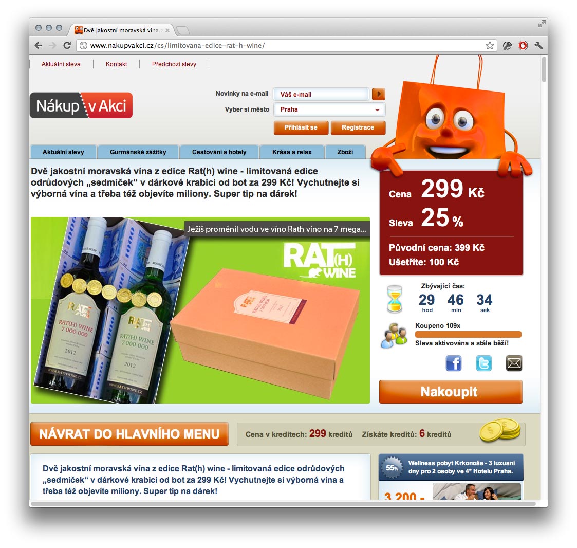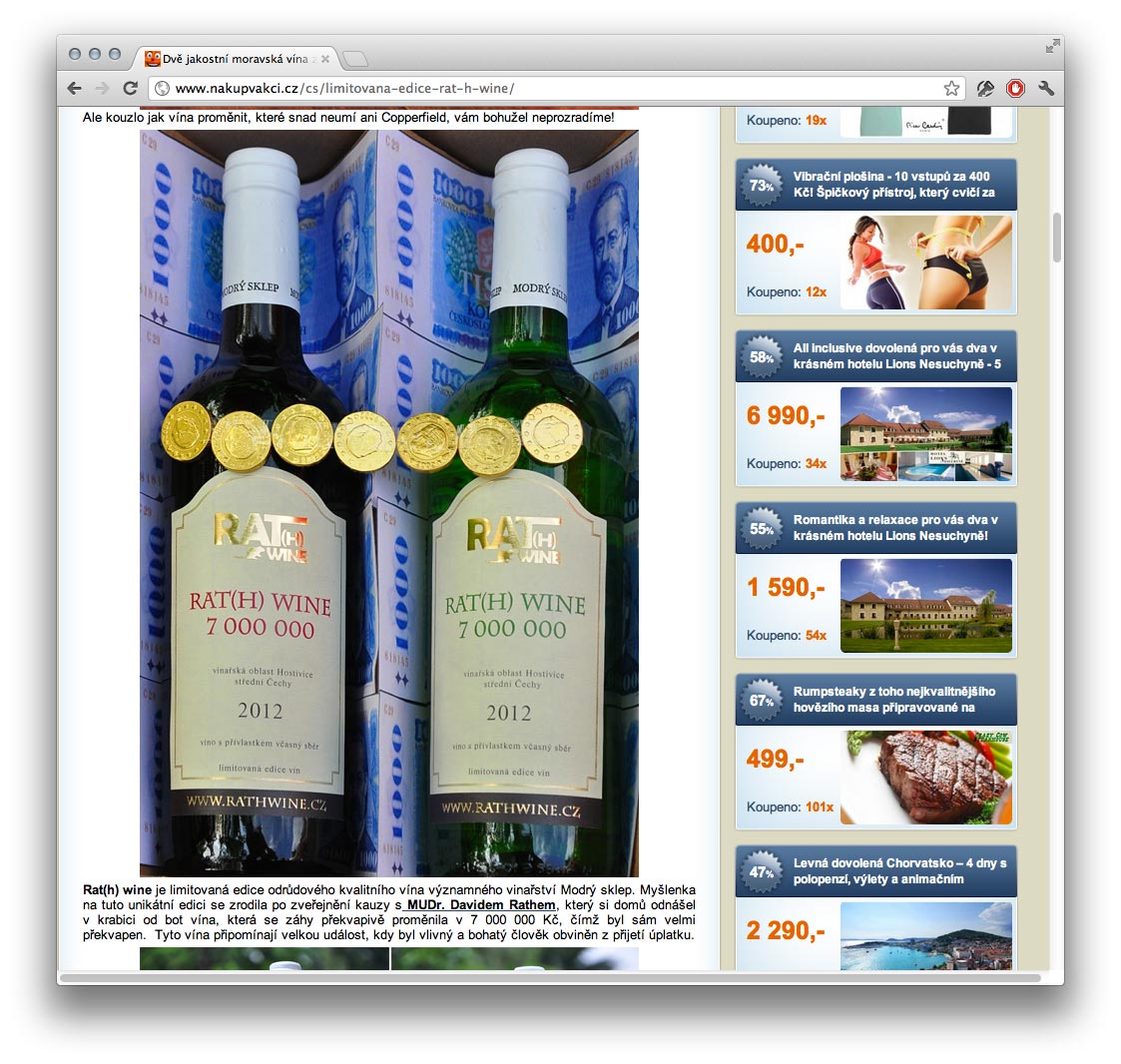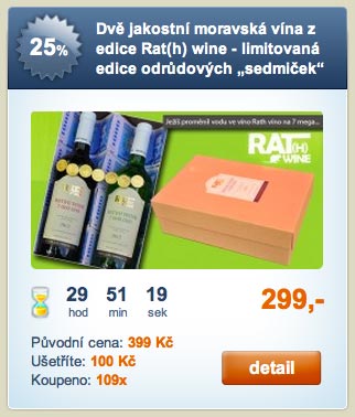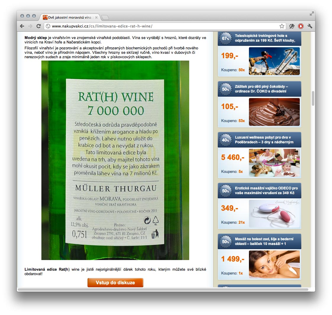 Na serveru Nákup v Akci se objevila zajímavá nabídka na nákup vína z limitované edice Rat(h) Wine. Jsou to dvě sedmičky z úrodné středočeské vinařské oblasti Hostivice dodávané (jak jinak) v krabici od bot. 🙂